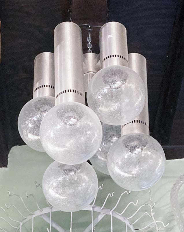 lampada a sospensione costituiti da cinque tubi in alluminio di diverse altezze accorpati, diffusori sferici in vetro. Italia, Anni ’60. Dimensioni: diametro cm 40, H cm 48