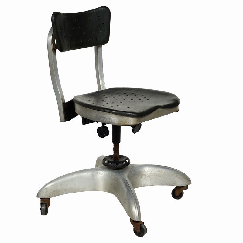 Gio Ponti (1891-1979), prod. Kardex. Italy, 1938. Gio Ponti (1891-1979), prod. Kardex. Italia, 1938. sedia girevole da ufficio, in acciaio, alluminio patinato e vinile, modello n. 1938, realizzata per la Montecatini S.A. uffici, Milano, 1936. Sotto la seduta stampa in rilievo: MONTECATINI S.A. / MODELLO 1938, sul retro dello schienale etichetta Kardex Italiano. , 80x60x60 cm. swivel chair, made in steel, patinated aluminium and vinyl, mod n. 1938, prod. Kardex, Italy, made for Montecatini S.A. uffici, Milano, 1936. Stamped under the seat :MONTECATINI S.A. / MODELLO 1938, on the reverse of the backseat Kardex Italiano label, 80x60x60 cm.