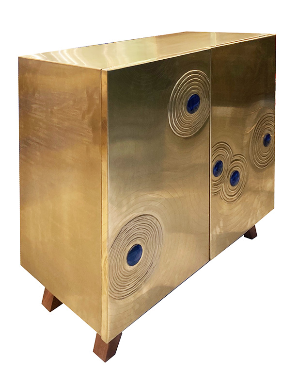 Mobile contenitore a due ante rivestito in ottone a decori circolari incisi con inserti in vetro blu. Dimensioni: cm 80 x42,5 x 80 h