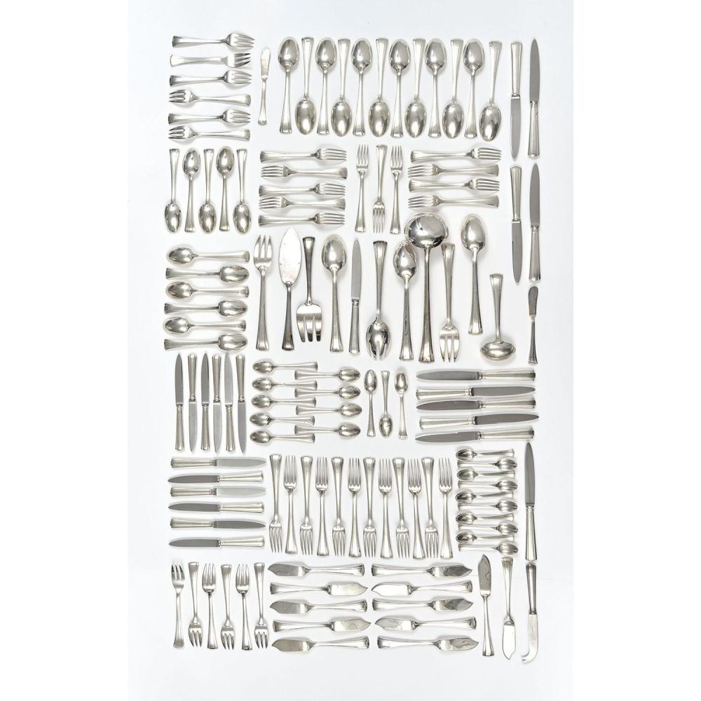 PUIFORCAT. Servizio di posate da 129 pezzi in argento 925°/°° modello Papiro composto da: 12 forchette da tavola grandi, 11 coltelli grandi, 12 cucchiai da tavola grandi, 10 cucchiaini da moka, 12 cucchiaini, 11 cucchiai da dessert, 12 coltelli da dessert, 1 mestolo, 12 forchette da dolce, 1 cucchiaio di salsa, 12 coltelli da pesce, 12 forchette da pesce, 2 set da portata inclusi 1 cucchiaio e 1 forchetta, 1 set da pesce (coltello e forchetta) 2 posate da insalata, 2 coltelli da burro, 1 coltello da formaggio, Peso Argento: 8,19 kg. Peso lordo totale: 10.660 kg. PUIFORCAT. Partie de ménagère de 129 pièces en argent 925 °/°° modèle Papyrus comprenant : 12 grandes fourchettes de table, 11 grands couteaux, 12 grandes cuillères de table, 10 cuillères à moka, 12 cuillères à thé, 11 cuillères à dessert, 12 couteaux à dessert, 1 louche
