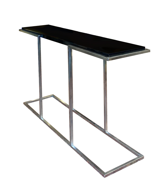 Coppia di consolles con struttura in tubolare di acciaio a sezione quadrata che accoglie un piano in legno laccato nero. Italia, Anni ’60. Dimensioni: cm 140x33x81 h