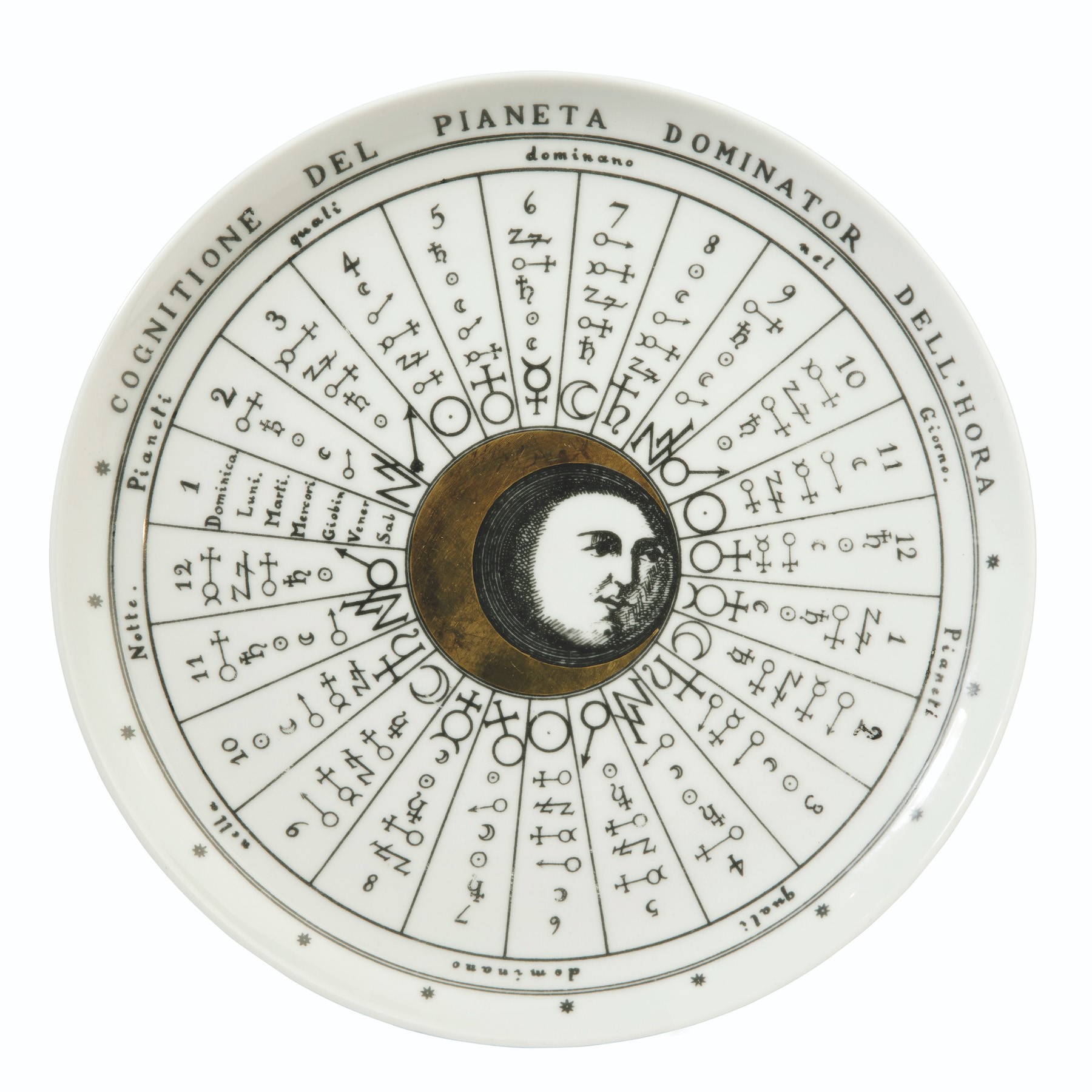 Piero Fornasetti (1913-1988) Milano, 1960 ca. Piatto in porcellana serie Astronomici con decoro serigrafato. diametro cm 26. Marchio della manifattura. P. Fornasetti, Milan, 1960 ca. Diam 26cm