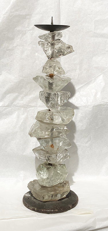 Coppia di candelabri in ferro e vetro molato, eseguiti in esclusiva per noi. Dimensioni: diametro cm 18, H cm 51
