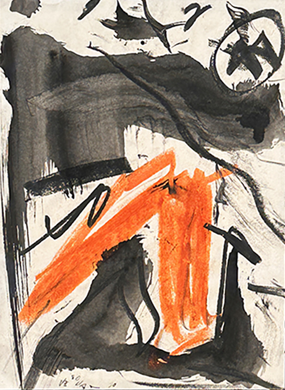 Emilio Vedova ( 1919-2006) Oltre, 1990, tecnica mista su carta, dimensioni: cm 21 x 28,5. Autentica Fondazione Emilio e Annabianca Vedova n. 328 del 3.9.2009. Bibliografia: Emilio Vedova e L’Informale veneto:Santomaso, Afro e Tancredi, a cura di A. Serri, Ed. Cinquantasei Bologna, febbraio Aprile 2015, pag. 56.