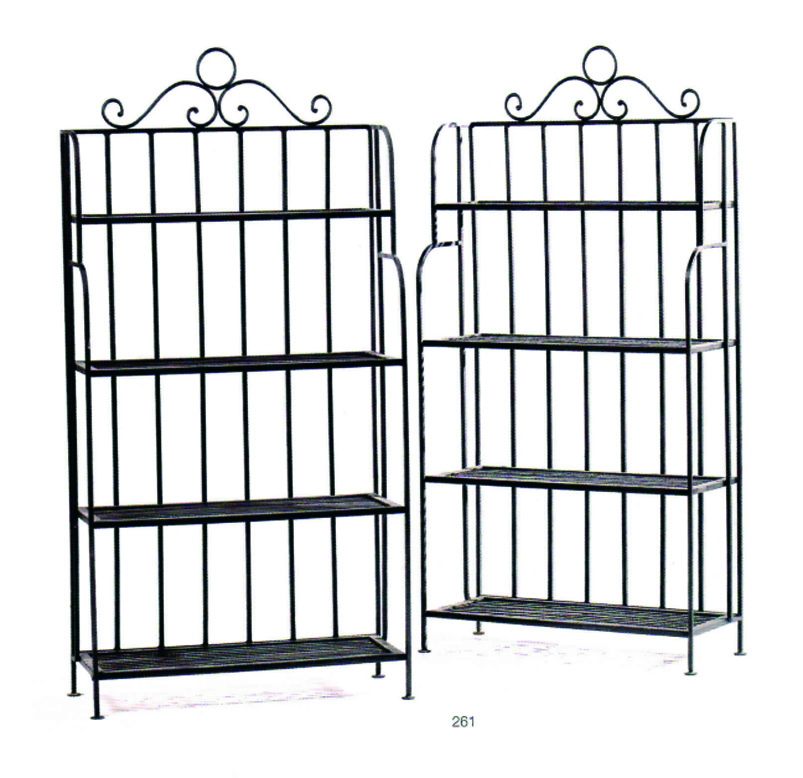 Coppia di étageres in ferro a quattro ripiani rettangolari, cimasa impreziosita da sagome arricciate. Dimensioni: cm 75 x 28 x 151 H.