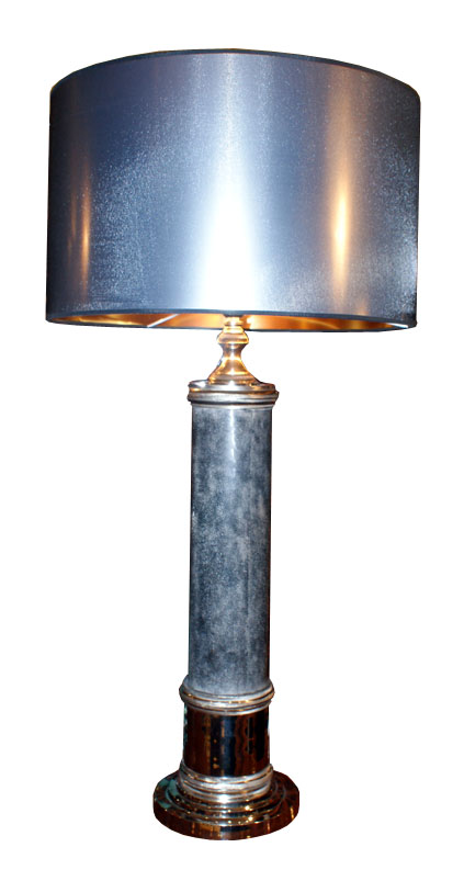 lampada da tavolo in acciaio e galuchat, dimensioni: diametro base cm 18, diametro paralume cm 45, H complessiva cm 90.