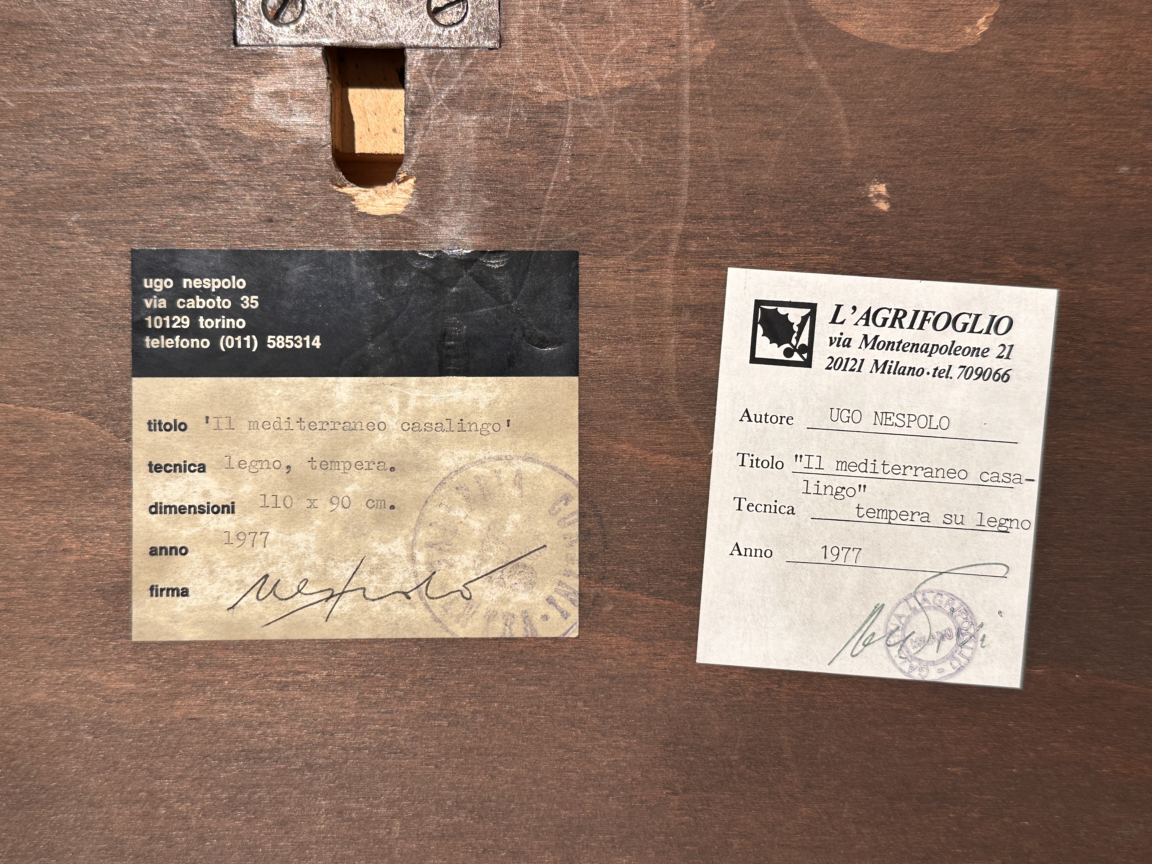 Ugo Nespolo (Mosso 1941). Il mediterraneo casalingo. 1977. Tempera su legno. Firma al retro su etichetta dell studio Ugo Nespolo. Etichetta di provenienza : Galleria L Agrifoglio Milano