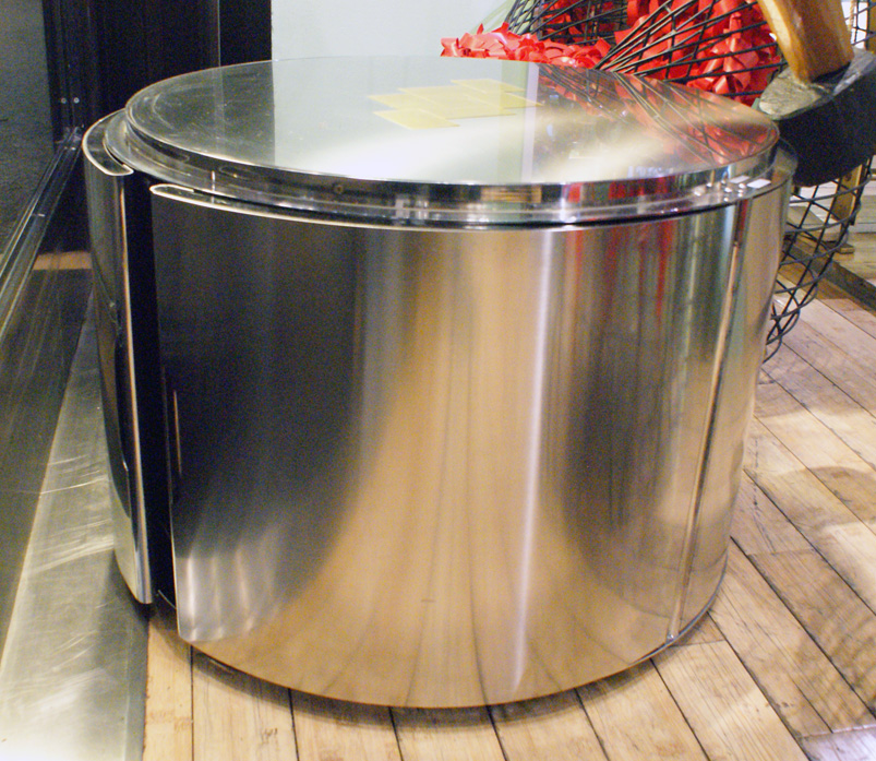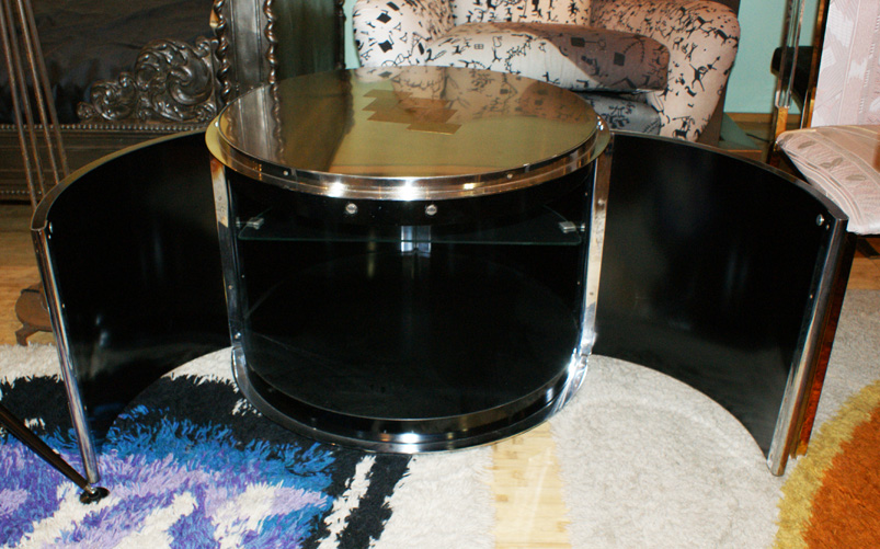 Tavolino bar di METALLARTE, Italia anni ’70. Tavolino a tamburo in acciaio e ottone con vano bar apribile nascosto da due ante a filo. Ripiano interno a mezzaluna in cristallo temperato. Dimesioni: cm 69 (diametro) x 51 H