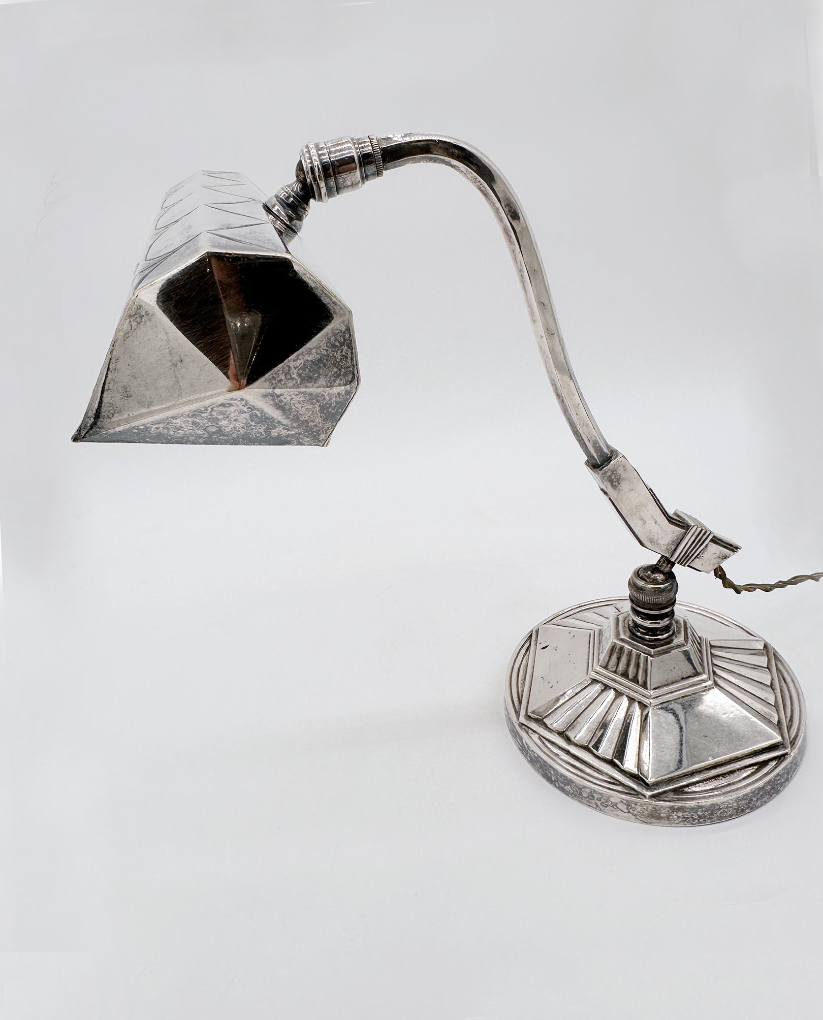 MONIX modello Numero 7019. – Lampada da tavolo Art Déco in bronzo nichelato e cesellato, realizzata tra il 1925 e il 1930 dal marchio francese MONIX di Maxime Lokiec. Base 15cm, altezza 30cm, dimensione massima 30cm.