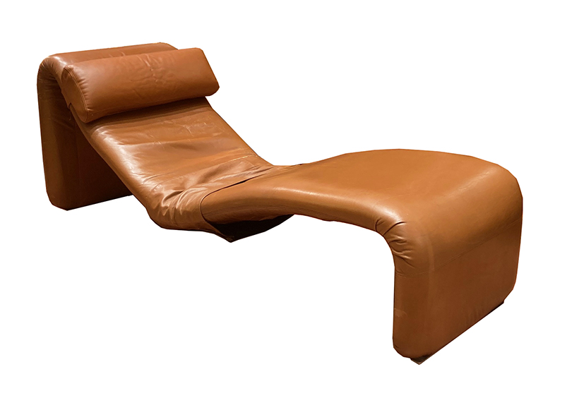 Oliver Morgue (Parigi 1939) Djinn Lounge Chair in versione in pelle nocciola realizzata dall l’azienda Francese Airborne nel 1965. Design reso famoso dall’apparizione in ‘2001: Odissea nello spazio’ di Stanley Kubrick. Nel 1968, la serie Djinn ha ricevuto il primo International Design Award dall’Institute of Interiors Designers. Dimensioni : cm L 168 x 60 P x 64 H