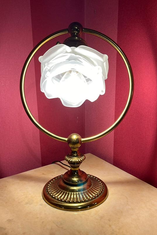 Lampada da tavolo in ottone con diffusore a forma di fiore in vetro soffiato. Anni ’60. Dimensioni: cm 19 x 12 x 31 H