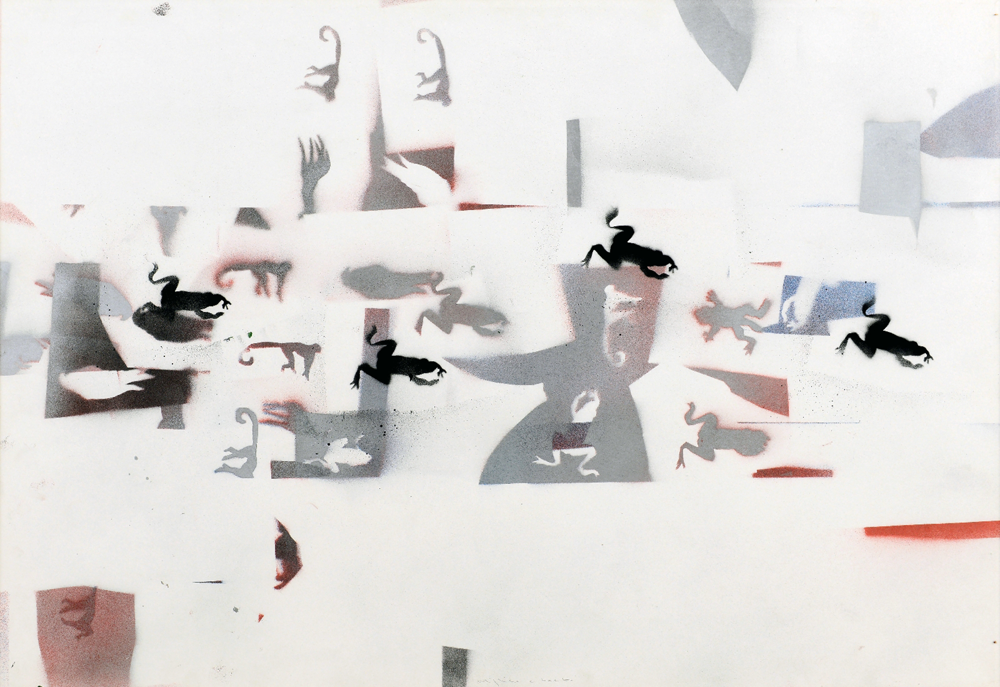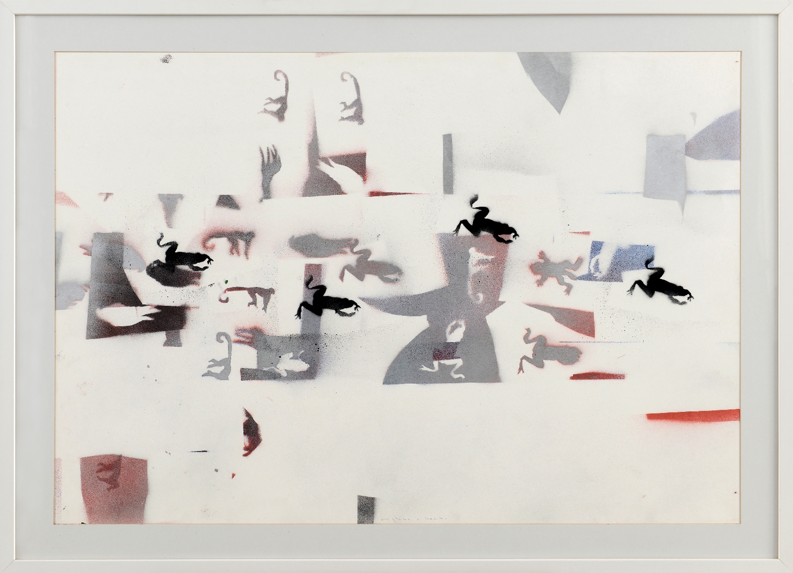 ALIGHIERO BOETTI. [Torino 1940 – Roma 24/04/1994]. Senza titolo (Rane), (1986). tecnica mista su cartoncino 70×100 cm, firma in basso al centro, firma ed etichetta della Galleria Fuoricentro (Roma) al retro, opera registrata presso l’Archivio Alighiero Boetti (Roma) come da dichiarazione su foto.