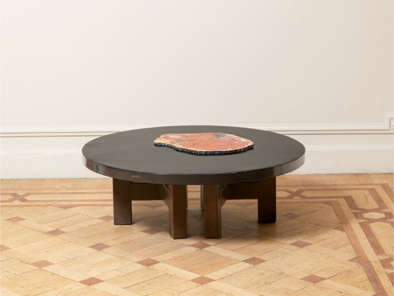 Ado Chale (1928). Tavolino. Piano in resina e legno pietrificato appoggiato su due basi formate da treppiede in acciaio patinato. Firma impreziosita con un set di rubini. Circa 1970. H.35,5 cm D.99,5 cm. Table basse. Plateau en résine et bois petrifié reposant sur deux piétements tripodes en acier patiné. Signature rehaussée d’un rubis serti. Circa 1970. H.35,5 cm D.99,5 cm