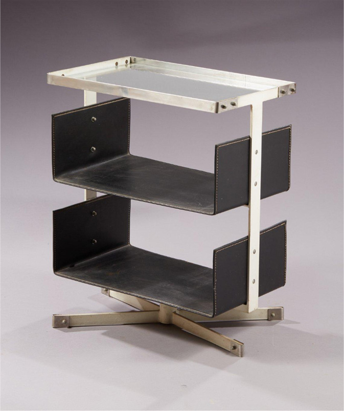 Tavolo da servizio, struttura in metallo laccato bianco e in parte rivestito in pelle nera, piano superiore in vetro. H: 62 cm / L: 52 cm / P: 32 cm. Table desserte, structure en métal laqué blanc et en partie gainé de cuir noir, plateau supérieur en verre. H : 62 cm / L : 52 cm / P : 32 cm Side table, white lacquered metal structure partly covered with black leather, glass top. H : 62 cm / L : 52 cm / P : 32 cm.