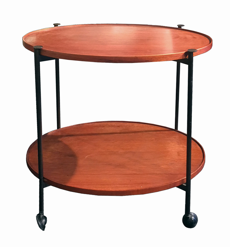 Carrello portavivande/bar con struttura pieghevole in metallo e due vassoi asportabili ovali in palissandro. Italia, Anni ’60. Dimensioni: cm 65 x 50 x 63 H.