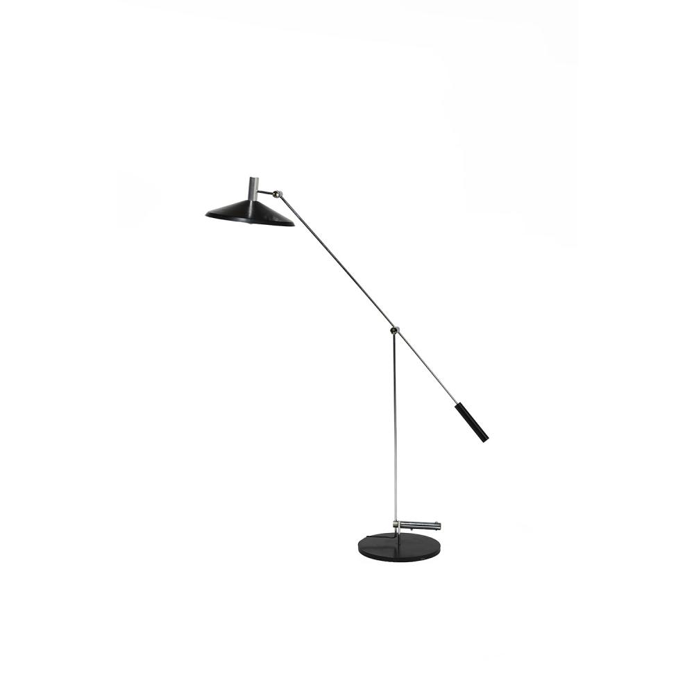 ROSEMARIE E RICO BALTENSWEILER. Lampada da terra modello 600 o Cappello cinese, stelo in acciaio nichelato, base in alluminio pressofuso e riflettori in lamiera di alluminio laccata nera. Edizione Baltensweiler AG. Circa 1950. Altezza 153 cm – Lunghezza totale 150 cm. ROSEMARIE ET RICO BALTENSWEILER. Lampadaire modèle 600 ou “Chinese hat”, fût en acier nickelé, base en fonte d’aluminium et réflecteurs en tôle d’aluminium laqués noir. Edition Baltensweiler AG. Circa 1950. Haut. 153 cm – Long. totale 150 cm. A model 600 floor lamp, also known as “Chinese Hat”, in nickel-plated steel, black lacquered aluminum sheet and cast aluminum. Edited by Baltensweiler AG. H. 60 1/4 in. ; Total length. 59 in.