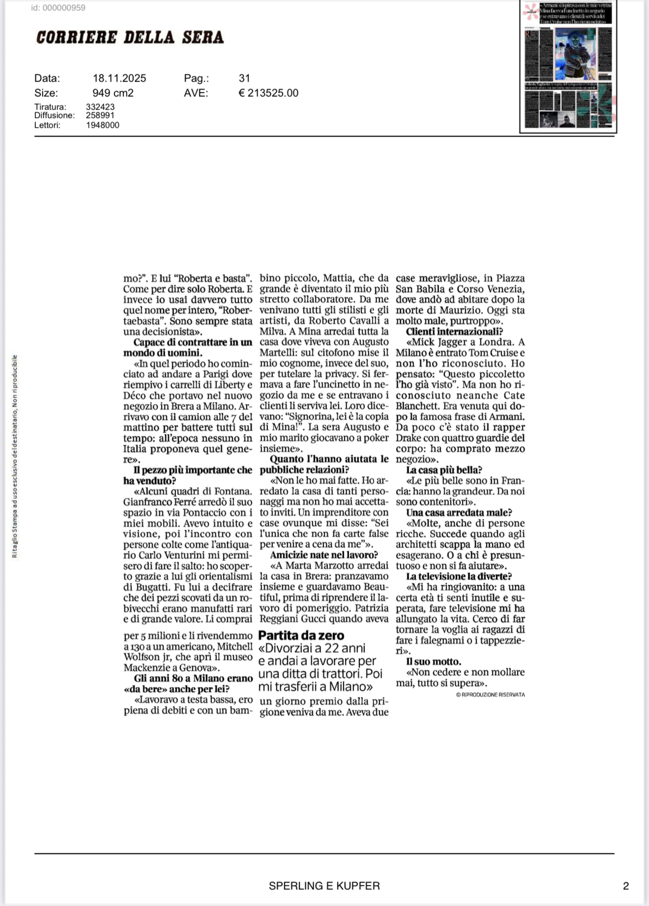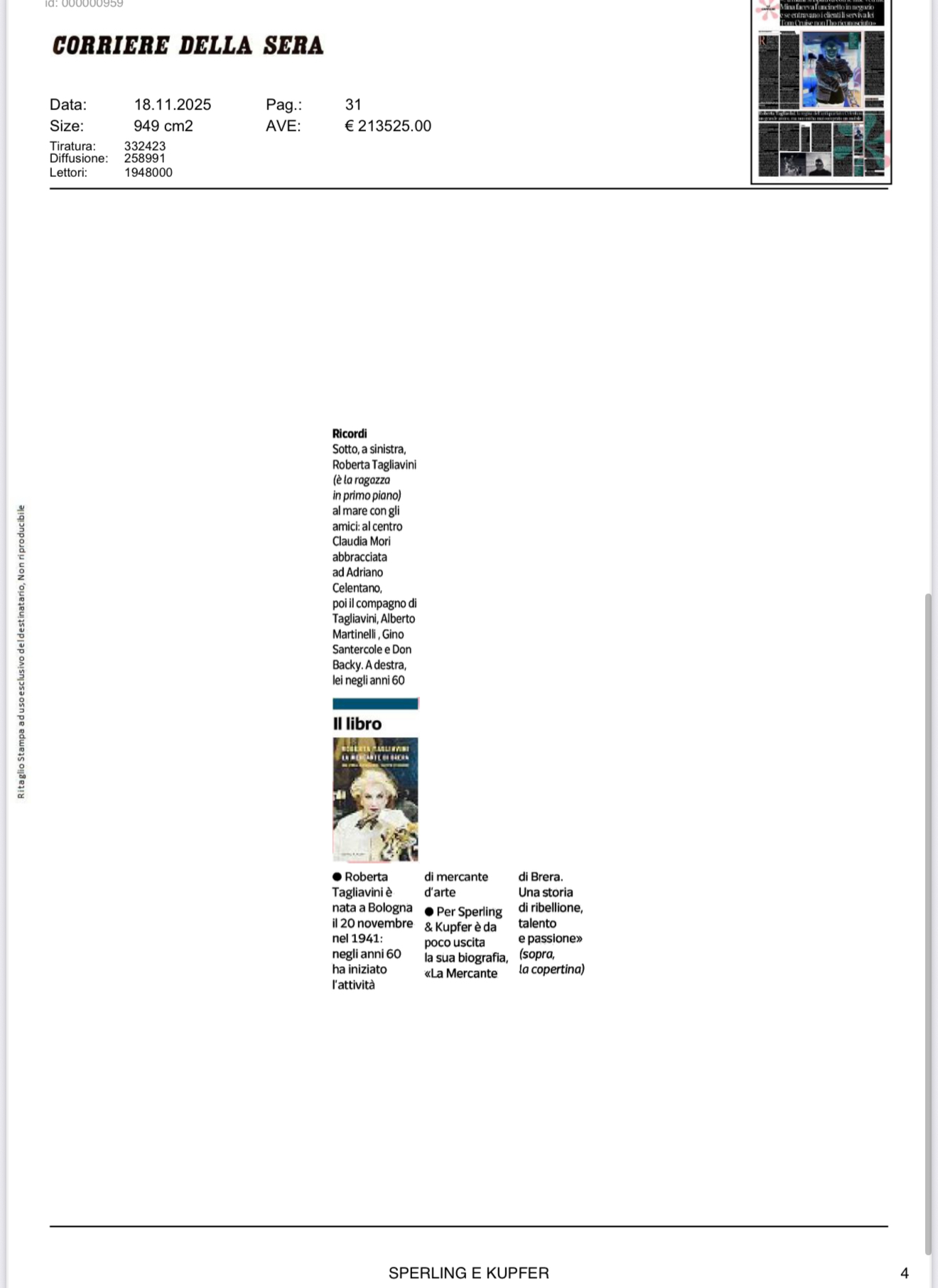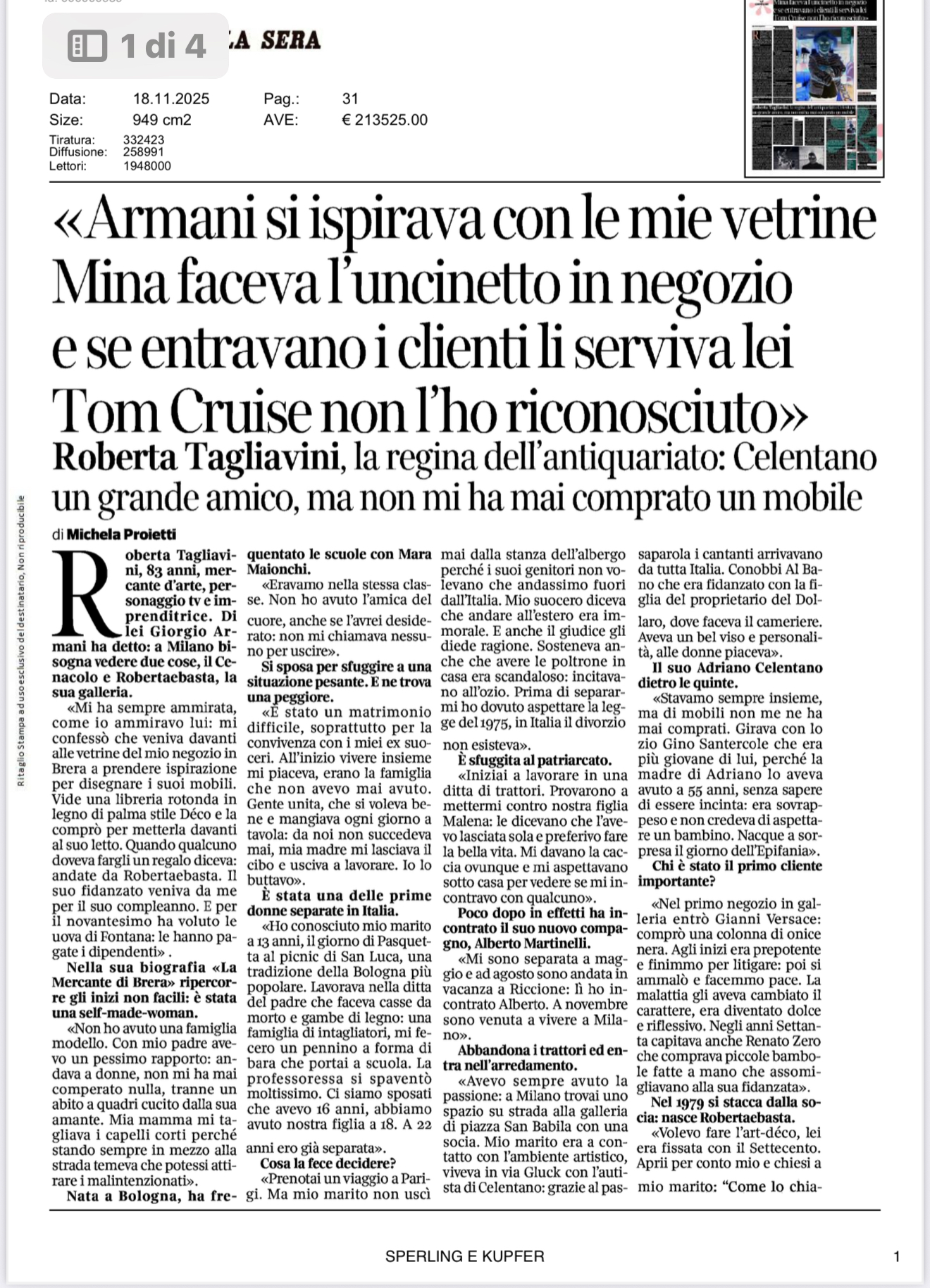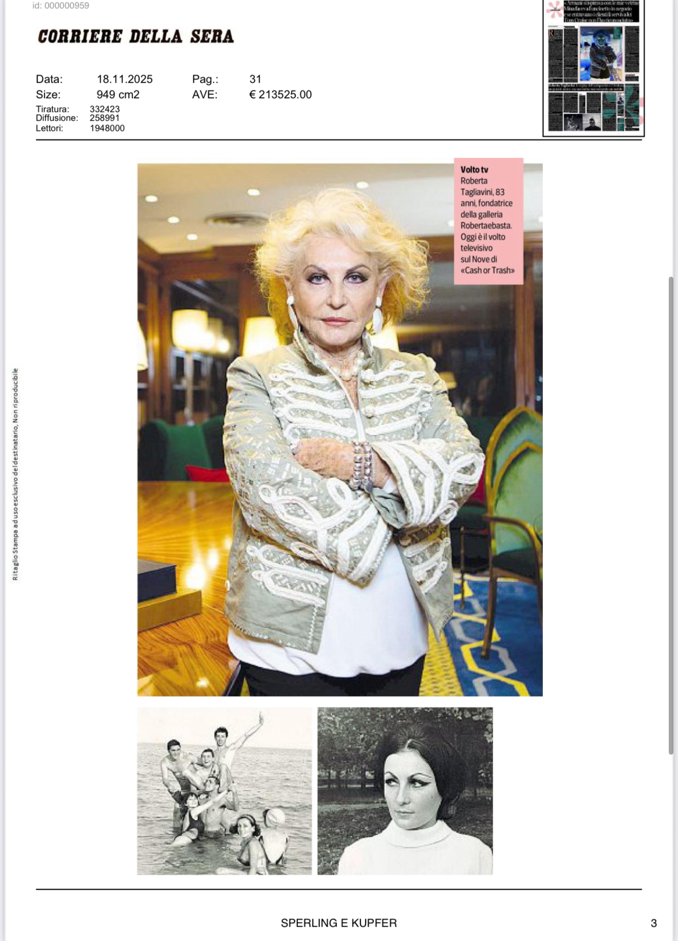 Il Corriere della Sera dedica un articolo a Roberta Tagliavini, 83 anni, mercante d’arte e imprenditrice nota come Robertaebasta. La sua carriera racconta una vita di indipendenza e determinazione, dalla giovane separazione alla fondazione della propria galleria a Milano, diventata punto di riferimento per artisti e collezionisti internazionali.